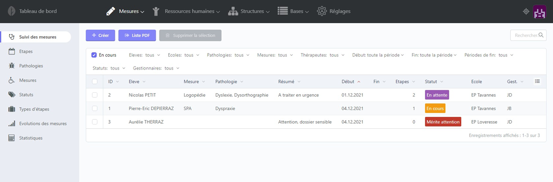 | Suivi des mesures | Le module de base de l'OMPP. Il regroupe le suivi d'une mesure donnée de l'enseigmenet spécialisé. Chaque suivi peut avoir plusieurs étapes liées. |